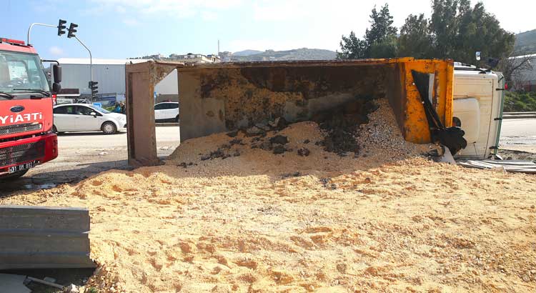 Hafriyat kamyonu yan yattı
