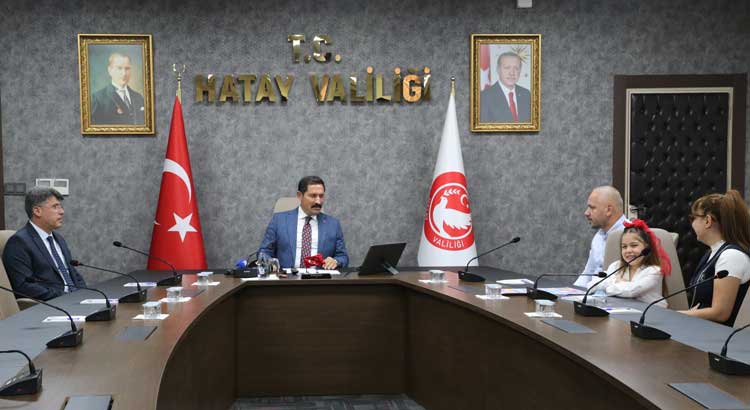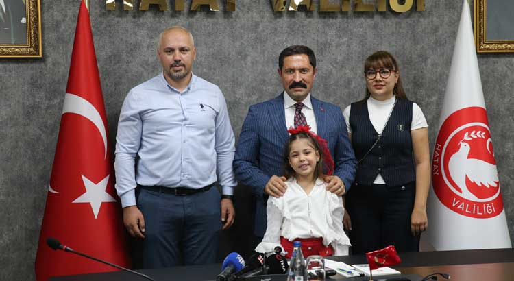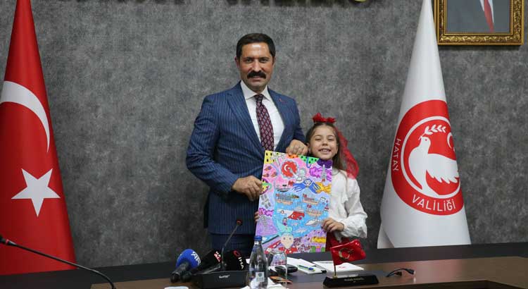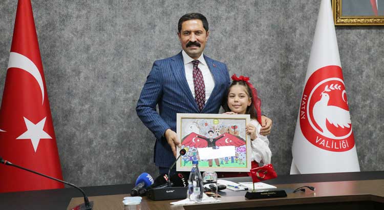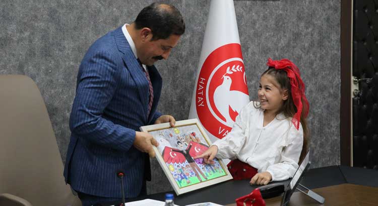 Hatay Valisi Mustafa Masatlı, TEKNOFEST Mavi Vatan Resim Yarışması’nın İlkokul kategorisinde Türkiye birincisi olan 8 yaşındaki Asya Alyanak’a takdir plaketi verdi.