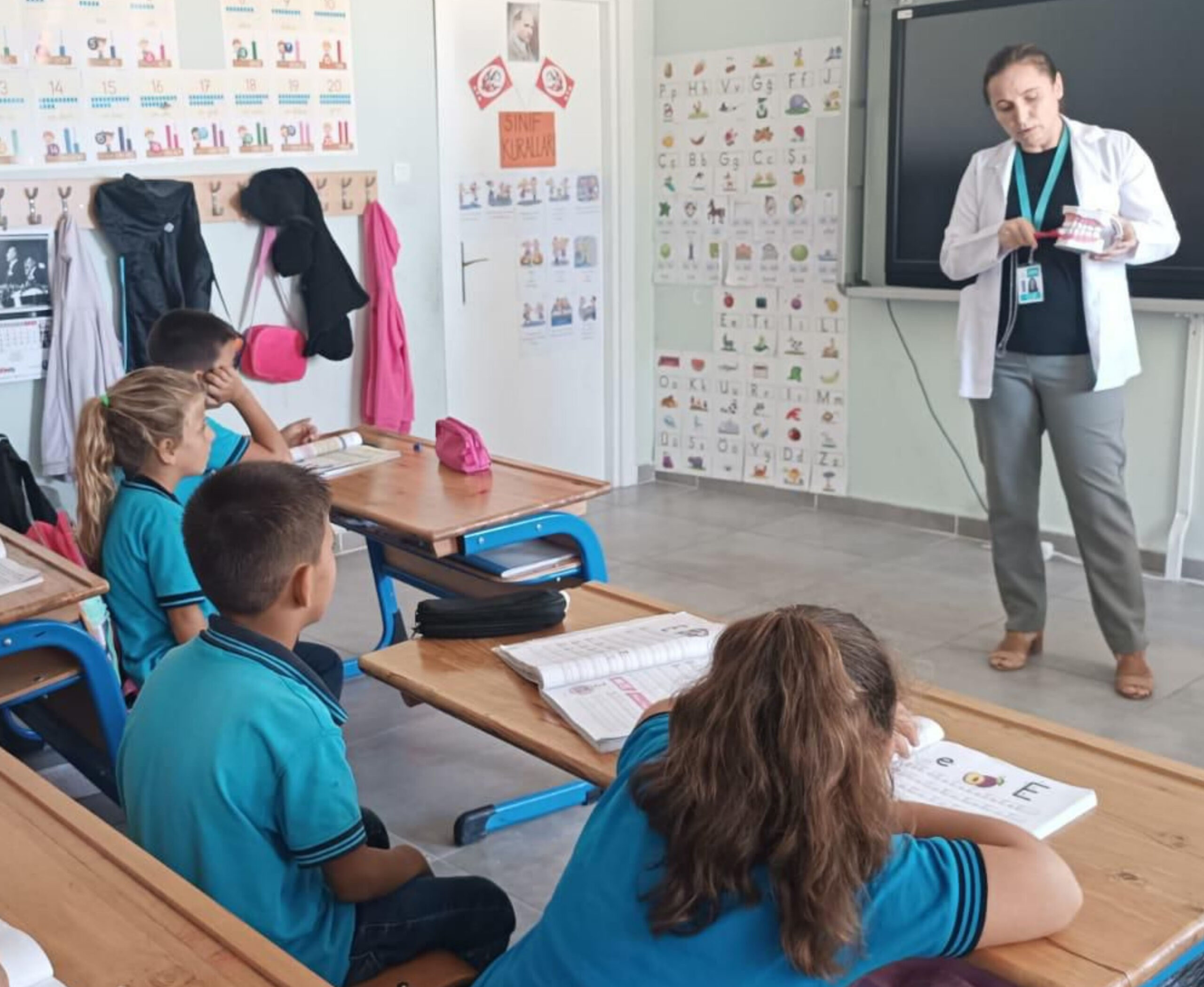 Diş Hekimi Yeliz Güven, çocuklarda diş sağlığının korunması amacıyla öğrencilere diş muayenelerinin yanısıra, ağız ve diş sağlığını korumak adına yapmaları gerekenleri anlattı.