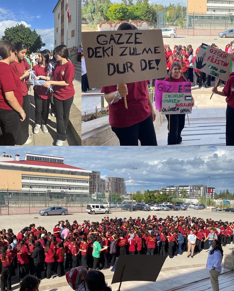 Okul bahçesinde bir araya gelen öğrenciler, ‘Gazze’ ve ‘Filistin’ yazısı oluşturarak Filistin’e destek mesajı verdi. Yumruklarını birleştirerek ‘Özgür Filistin’ mesajı da veren öğrenciler, düzenlenen etkinliklerle Gazze’de yaşanan insani dramın son bulmasını dileyerek, barışa yönelik çağrıda bulundu.