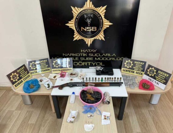 Adreslerdeki aramalarda, 149 gram sentetik uyuşturucu, 83 sentetik uyarıcı, ruhsatsız av tüfeği, 14 kartuş ile ruhsatsız kuru sıkı tabanca ele geçirildi.