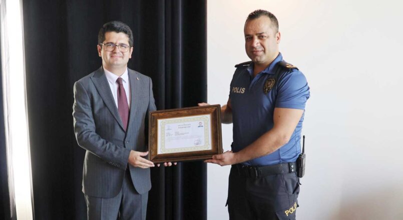 Kaymakam Eroğlu, veda yemeğinin ardından Müdür Gün’e başarı belgesi takdim etti.