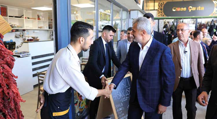 Hatay Büyükşehir Belediye Başkanı Mehmet Öntürk, yıkım ve restorasyon çalışmaları nedeniyle prefabrik çarşıya taşınan tarihi Uzun Çarşı esnafını, yeni prefabrik çarşıda ziyaret etti.