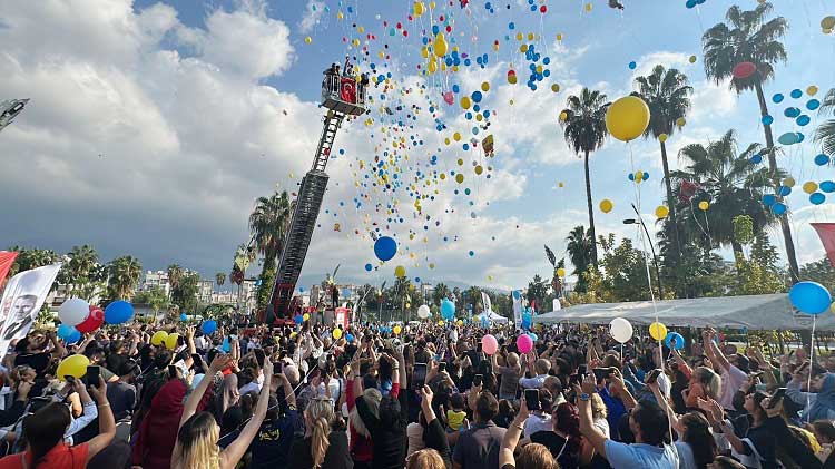 Motorcuların konvoyu eşliğinde alana giriş yapan Tamer Talha, burada Büyükşehir Belediyesi’ne ait İtfaiye aracının merdivenine çıkarak, katılımcılarla rengarenk balonları gökyüzüne bıraktı.