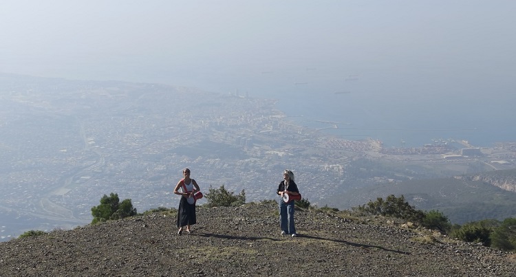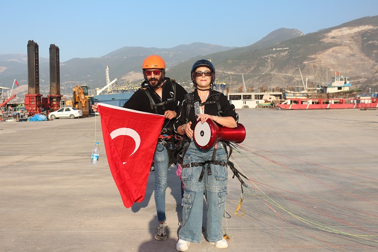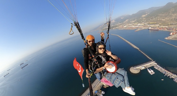 Amanos Dağları’ndaki kalkış alanına giden paraşüt pilotu İlker Özgüven ile Seda Arslan darbukayla yamaçtan havalanarak paraşütle tandem uçuşu gerçekleştirdi.