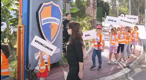 Öğretmenleri eşliğinde ‘Geleceğin Sporcuları Bugünün Sporcuları ile Buluşuyor’ temasıyla gerçekleştirilen ziyarette, Mustafa Kemal Atatürk’ün ‘Ben sporcunun zeki, çevik ve ahlaklısını severim’ sözünü içeren pankartıyla İskenderunspor Tesisleri’ne giriş yapan öğrenciler, futbolcuların alkışlarıyla karşılandı.