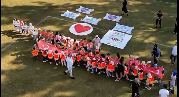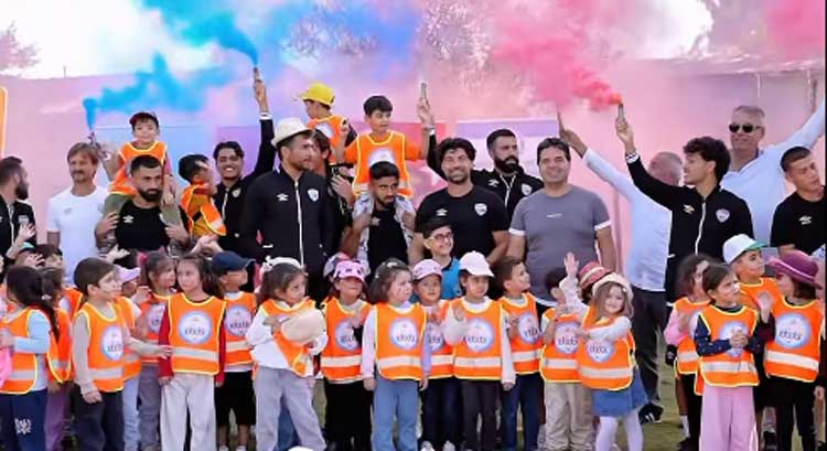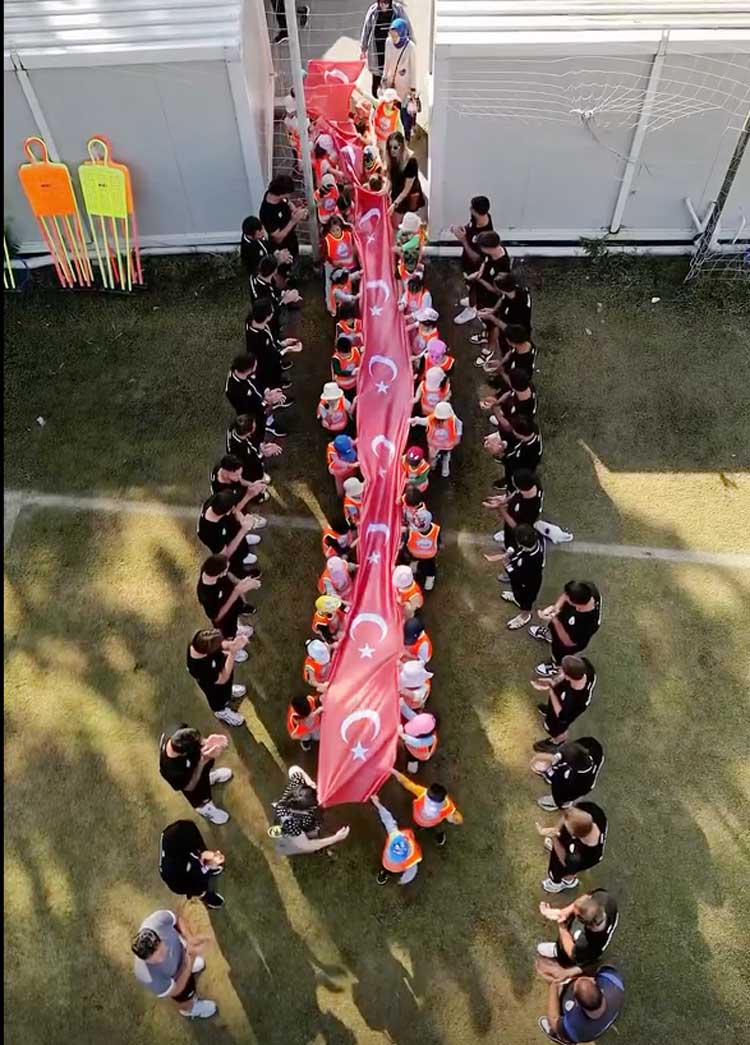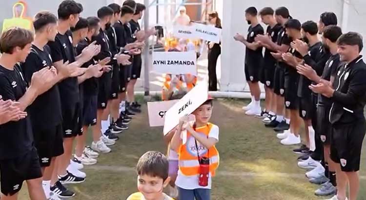 Keyifli ve eğlenceli anlara sahne olan ziyarette takıma sevgilerini yeşil sahada açtıkları kalpli pankartla dile getiren minik öğrencilerle hatıra fotoğrafı çekilen sporcular, turuncu – mavili meşaleler yaktı.