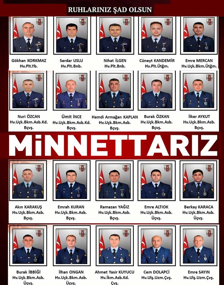 Yüreklere ateş düşüren kazada şehit personelin isimlerinin belirlenmesinin ardından, yetkililer Hava Astsubay İlker Aykut(27) Tekirdağ- Muratlı, Hava Uçak Bakım Üsteğmen Emre Mercan Eskişehir Emek Mahallesi, Hava Uçak Bakım Astsubayı Kıdemli Başçavuş Nuri Özcan(53) Karabük, Hava Kuvvetleri personeli Astsubay Emrah Kuran Muğla Milas, Hava Pilot Binbaşı Serdar Uslu(39) Bursa, Hava Uçak Bakım Astsubay Üstçavuş Berkay Karaca(27) Kırklareli –Lüleburgaz, Hava Uçak Bakım Astsubay Üçüncü Sınıf Burak İbbiği Çorum Merkez Yaydiğin köyü, Hv. Uçk. Bkm. Astsubay Başçavuş Hamdi Armağan Kaplan Amasya, Hava Pilot Üsteğmen Cüneyt Kandemir Ankara, Emre Altıok(32) Samsun, Hava İkmal Astsubay Kıdemli Çavuş Ahmet Yasir Kuyucu (Konya), Hava Ulaştırma Uzman Çavuş Emre Sayın (40) Balıkesir – Karesi, Hava Uçak Bakım Astsubay Üstçavuş İlhan Ongan(31) Bilecik, Hava Pilot Binbaşı Nihat İlgen Kayseri, Hava Uçak Bakım Astsubay Başçavuş Akın Karakuş Sakarya, Pilot Yarbay Gökhan Korkmaz İstanbul Büyükçekmece’ deki ailelerine şehadet haberlerini verdi.