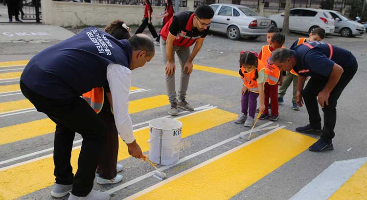 Hatay’da ilk olarak yapılan ve trafikte farkındalık oluşturma bilincini sağlayan proje kapsamında bilgi veren HBB yetkilileri, uygulama sırasında trafik bilincini aşılamak adına lise ve anaokulu öğrencileri ile birlikte çizgileri boyadı.