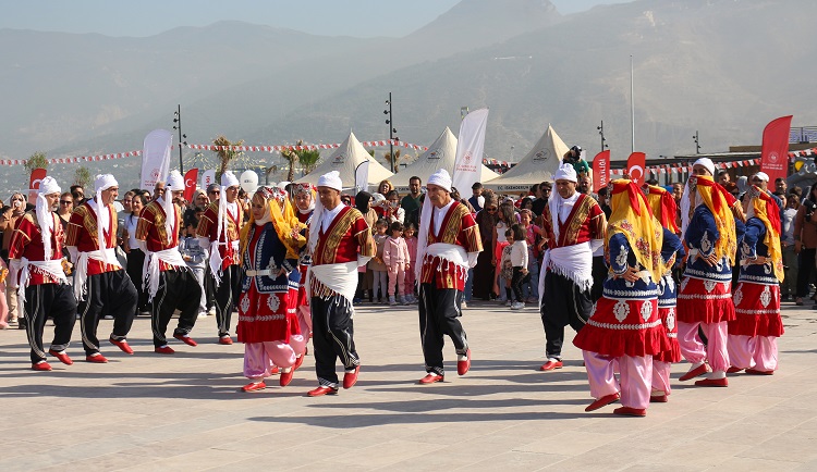 Çocukların halk oyunları ve folklor gösterisi sunduğu programda katılımcılar, gökyüzüne beyaz güvercin uçurdu.