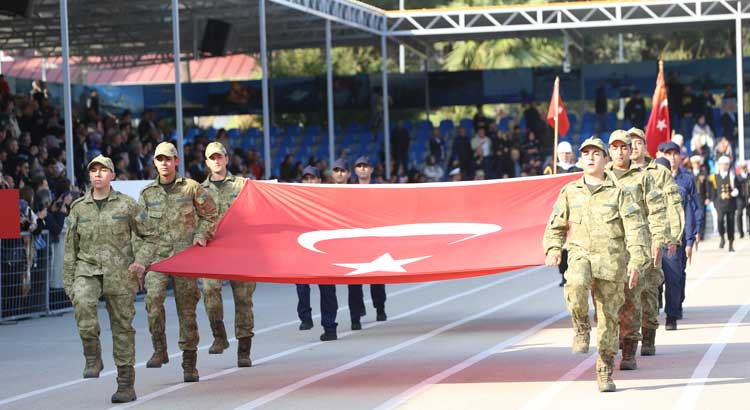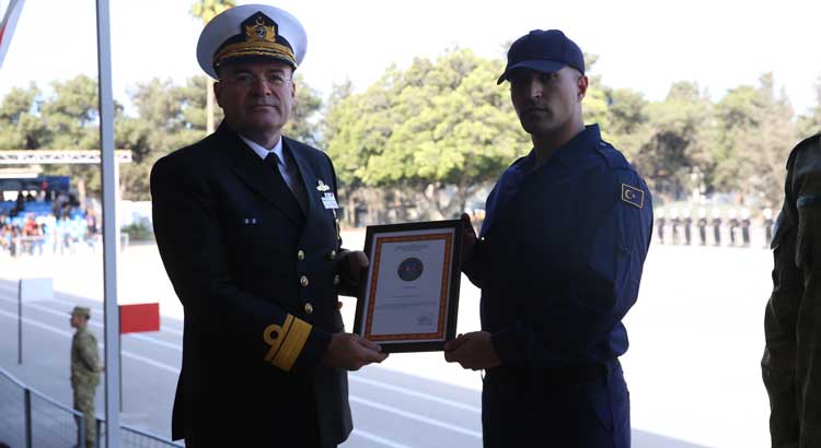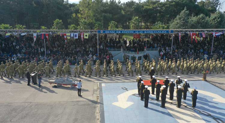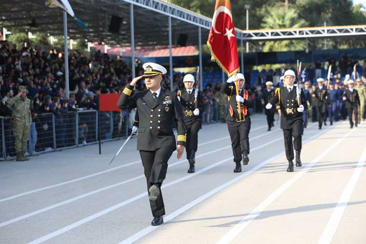 2025-4 dönem acemi erler için düzenlenen törende sancak geçişinin ardından, İskenderun Deniz Üs Komutanı Tuğamiral Osman Çevik, askerleri ve aileleri selamladı.