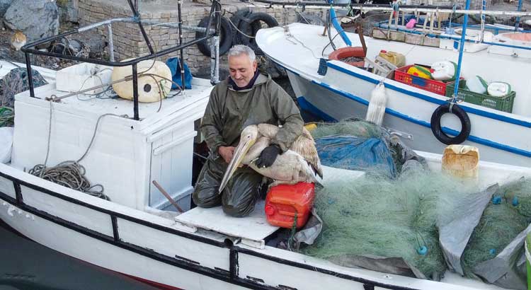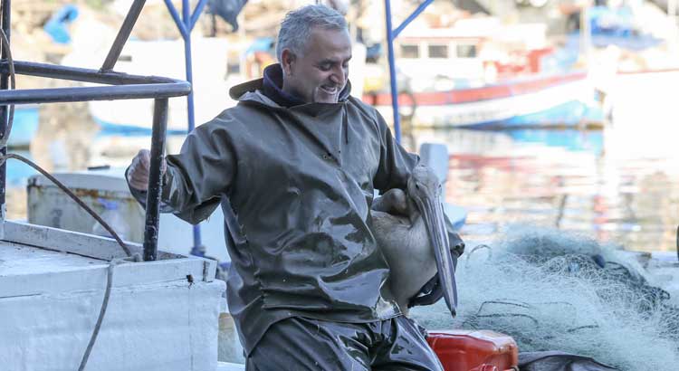 Uçar, pelikanı kucağına alıp sevdiğini belirterek, “Bazı sabahlar beni bekliyor ve yanıma geliyor. Ağları seçerken benden balık alıp yiyor. Bazen de kucağıma alıyorum. Balık yedikten sonra biraz geziyor, sonra geri geliyor. O buranın maskotu. Herkes çağırıyor, seviyor ve balık veriyor. Evladımız gibi oldu, alıştık kendisine. O bize yaklaşıyor, biz de onu seviyoruz” şeklinde konuştu.