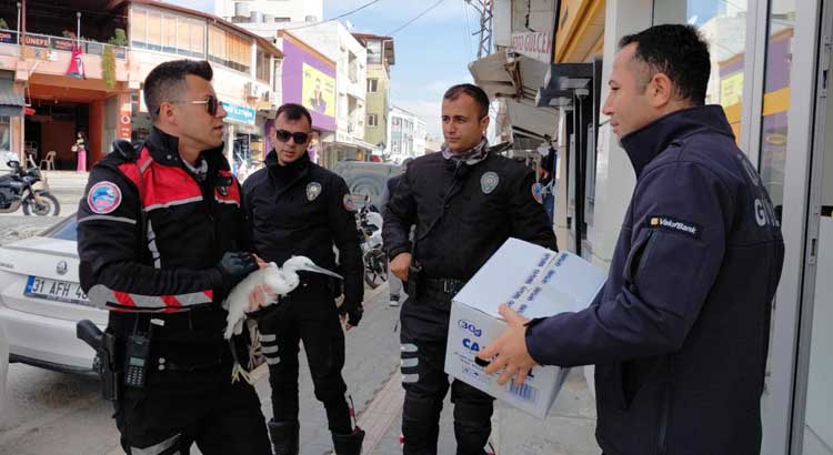 Atatürk Mahallesi’nde devriye görevinde bulunan İlçe Emniyet Müdürlüğüne bağlı ekipler, yol kenarında gözünden yaralı ak balıkçıl buldu.