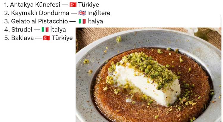 Kullanıcı yorumları ve eleştirmenlerin verdiği puanlarla belirlenen tatlılar listesinde dünyanın en iyi tatlısı ‘Antakya Künefesi’ seçildi.