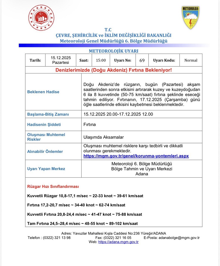 Yetkililer balıkçılar ve denizciler başta olmak üzere olumsuz hava koşullarına karşı gerekli önlemlerin alınması çağrısında bulunurken, yapılan meteorolojik uyarıda şu ifadeler yer aldı; “Doğu Akdeniz’de rüzgarın, bugün (Pazartesi) akşam saatlerinden sonra etkisini artırarak kuzey ve kuzeydoğudan 6 ila 8 kuvvetinde (50-75 km/saat) fırtına şeklinde eseceği tahmin ediliyor. Fırtınanın, 17.12.2025 (Çarşamba) günü öğle saatlerinde etkisini kaybetmesi beklenmektedir. Başlama-Bitiş Zamanı ; 15.12.2025 20.00 – 17.12.2025 12.00”