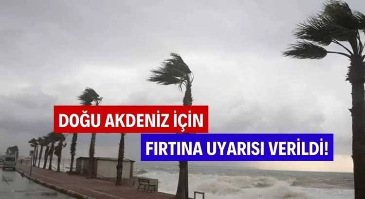 Meteoroloji Genel Müdürlüğü, Doğu Akdeniz için fırtına uyarısında bulundu. Yapılan değerlendirmelere göre, rüzgârın bugün akşam saatlerinden sonra etkisini artırarak kuzey ve kuzeydoğu yönlerinden saatte 50-75 km. hızla esmesi bekleniyor. Fırtınanın, 17 Aralık Çarşamba günü öğle saatlerinde etkisini kaybetmesi bekleniyor.