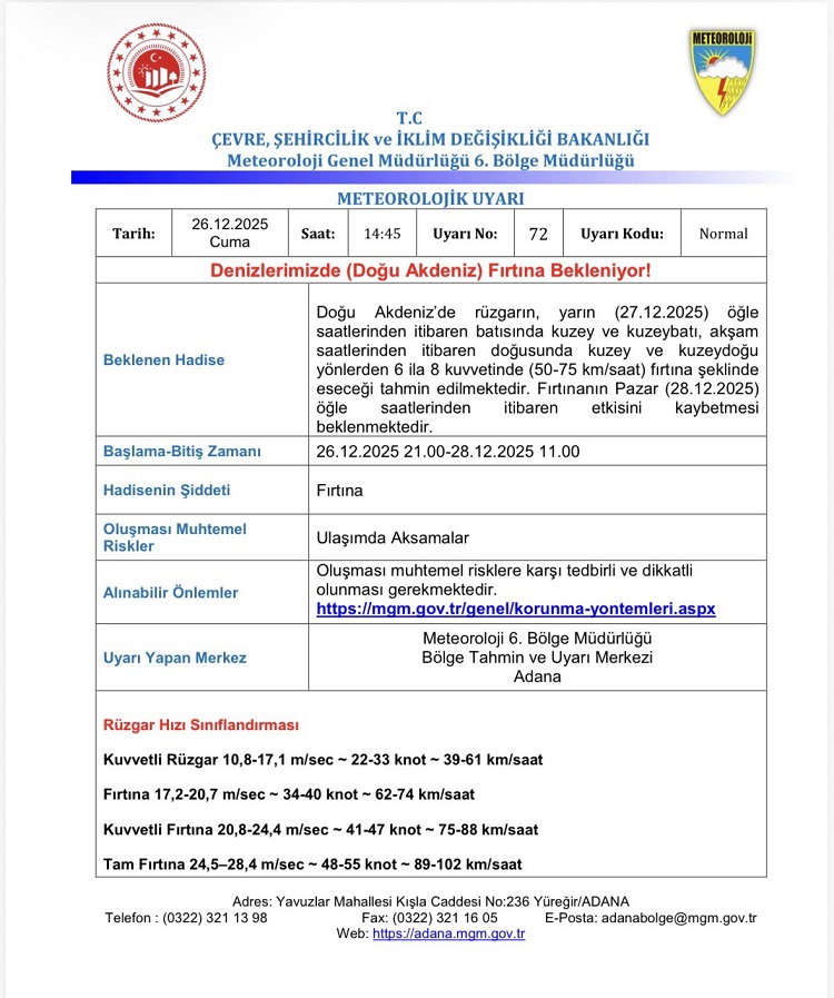 Doğu Akdeniz’de rüzgarın, yarın (27.12.2025) öğle saatlerinden itibaren batısında kuzey ve kuzeybatı, akşam saatlerinden itibaren doğusunda kuzey ve kuzeydoğu yönlerden 6 ila 8 kuvvetinde (50-75 km/saat) fırtına şeklinde eseceği tahmin edilmektedir. Fırtınanın Pazar (28.12.2025) itibaren etkisini kaybetmesi öğle saatlerinden beklenmektedir.