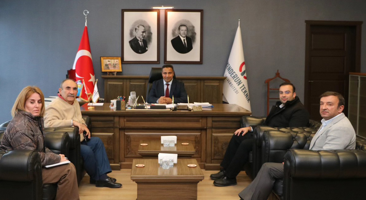 Yazıcı Demir Çelik Fabrikaları Genel Müdürü Osman Gözükara ile Hatay Büyükşehir Belediyesi Park ve Bahçeler Dairesi Başkanı Ökkeş Yayman, İSTE Rektörü Prof. Dr. Mehmet Duruel’i makamında ziyaret etti.