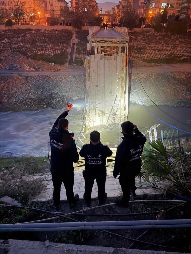 AFAD ve Hatay Büyükşehir Belediyesi ekipleri, Defne’de bir bölümü yıkılan yaya köprüsünün çevresinde önlem aldı.