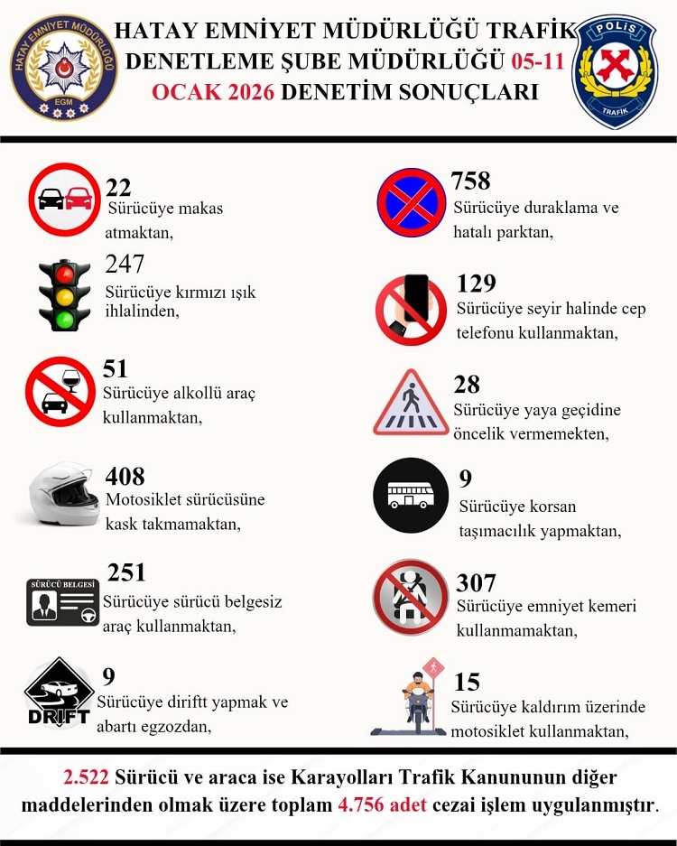Hatay İl Emniyet Müdürlüğü, 05-11 Ocak 2026 tarihleri arasında il genelinde gerçekleştirilen trafik denetimlerinin sonuçlarını açıkladı. Trafik Polis Denetleme Şube Müdürlüğü ekiplerince geçtiğimiz hafta yapılan denetimlerde 4 bin 756 sürücü ve araca cezai işlem uygulandı.