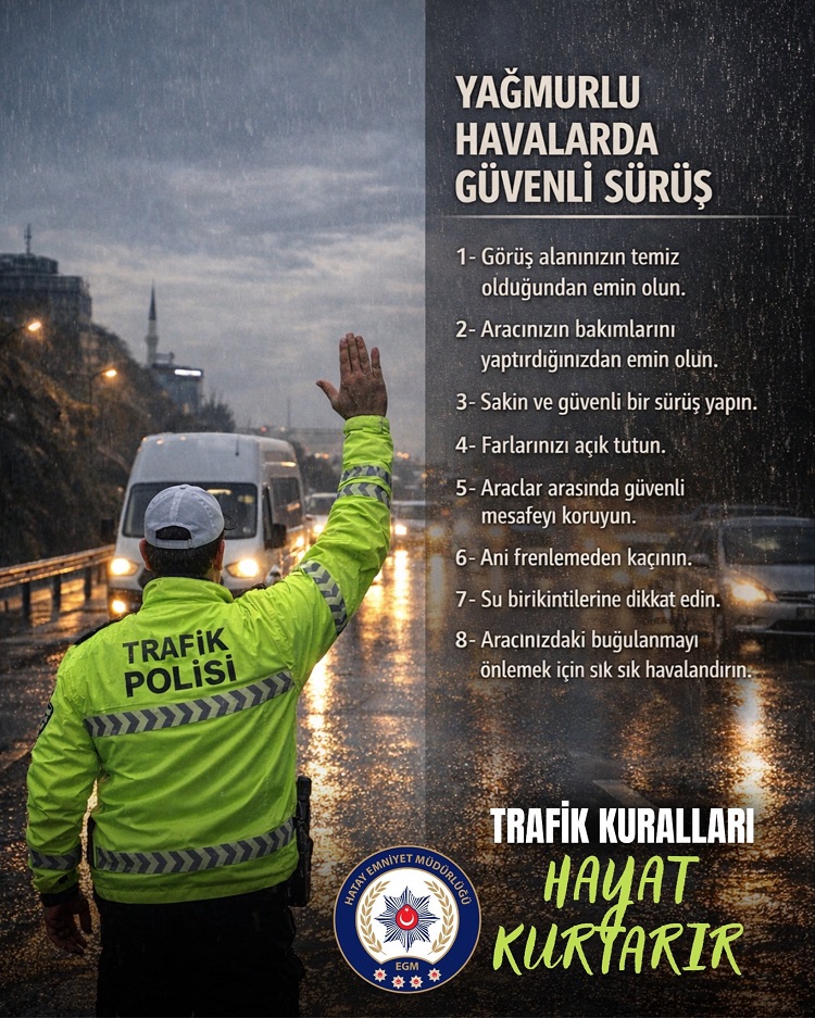 Araç sürücülerine hem kendi, hem de başkalarının hayatını korumak için trafik kurallarına uyulması çağrısı yapan Hatay Polisi, karlı ve yağışlı havalarda güvenli sürüş için sürücülere şu uyarılarda bulundu, “Görüş alanınızın temiz olduğundan emin olun. Aracınızın bakımlarını yaptırdığınızdan emin olun. Sakin ve güvenli bir sürüş yapın. Farlarınızı açık tutun. Araçlar arasında güvenli mesafeyi koruyun. Ani frenlemeden kaçının. Su birikintilerine dikkat edin. Aracınızdaki buğulanmayı önlemek için sık sık havalandırın.”