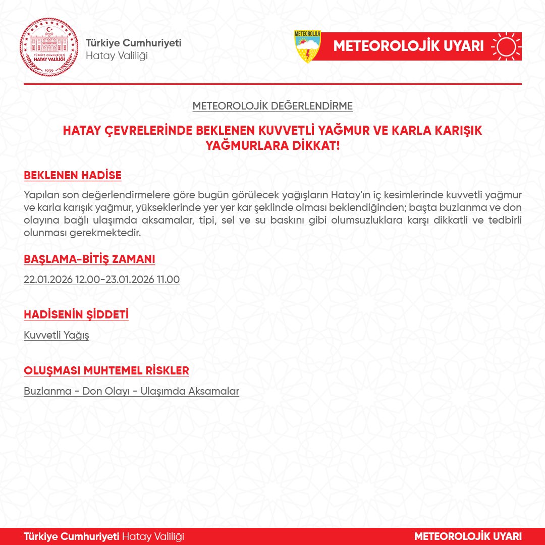 Genel, Gündem, Önemli HaberHatay’da kuvvetli yağmur ve karla karışık yağmurlara dikkat! Oluşturulma Tarihi: 22 Ocak 2026 – 10:23 Yazar: Söz Gazetesi Uzat elini kardeşim! Toprağın sırları da artık yapay zekada!