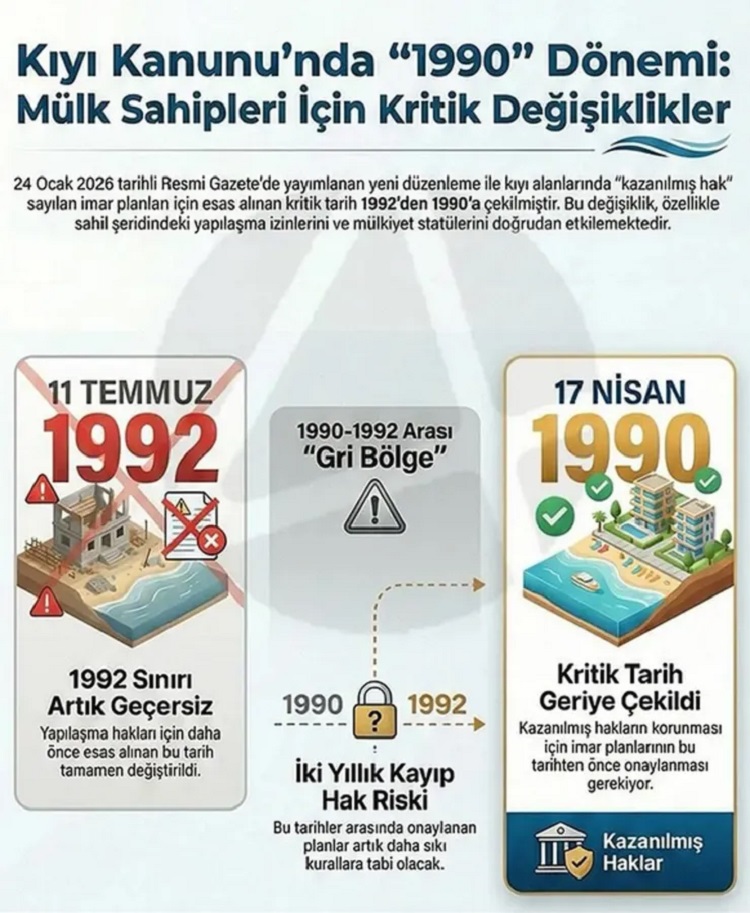 2. İki Yıllık “Hak Kaybı” Riski; 1990 ile 1992 yılları arasında onaylanmış planlara sahip olanlar artık “eski ve daha esnek” kurallardan yararlanamayabilir. Bu planlar, güncel ve daha kısıtlayıcı kıyı kanunu kurallarına tabi olacak.