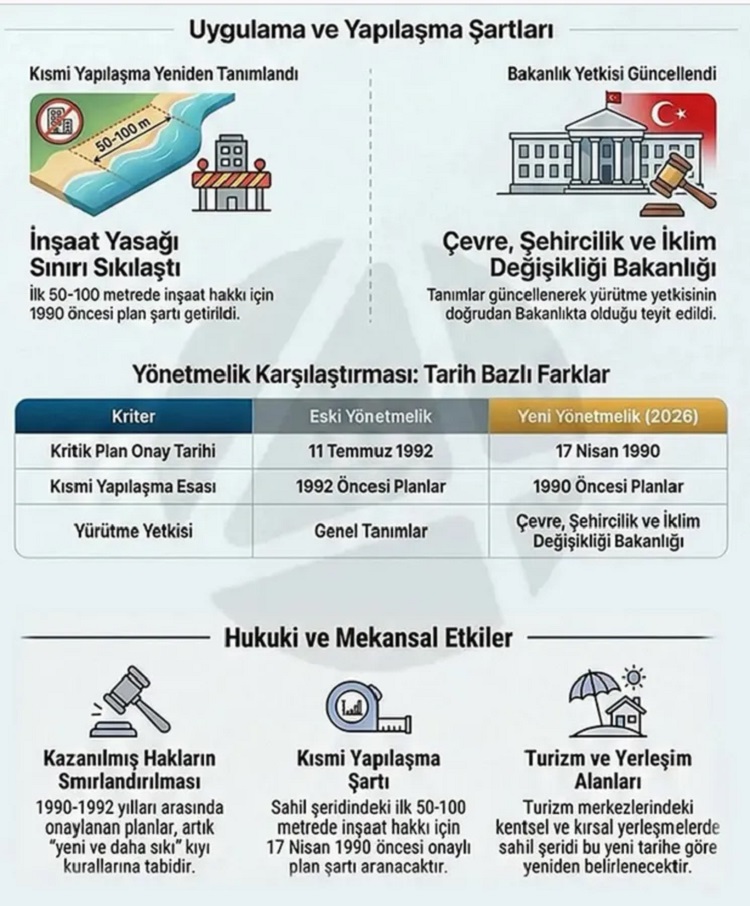 Bu düzenleme, “kısmi yapılaşma” gibi tanımlar açısından sahil şeridi belirlenmesinde yeni bir başlangıç noktası oluştururken, turizm merkezleri, turizm alanları ve bu bölgelerdeki imar ve yapılaşma süreçlerini de yakından ilgilendirecek.