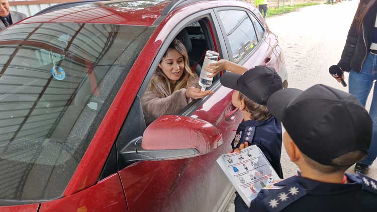 Çocuklar ayrıca, uygulama noktasında durdurulan araçlardaki sürücülere ve kişilere çikolata ve kolonya dağıttı.