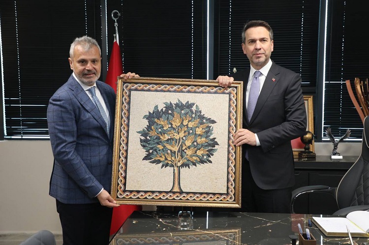 Başkan Öntürk, Bakan Bayraktar’a “Doğduğu bu toprakların ayağa kalkış sürecinde hep yanında olan ve desteğini hiçbir zaman bizden esirgemeyen Sayın Bakanımıza ziyaretleri için teşekkür ediyorum” diyerek, mozaik işlemeli tablo hediye etti.