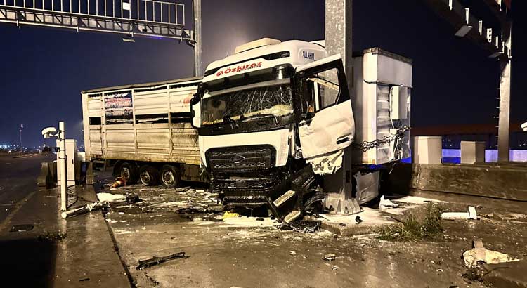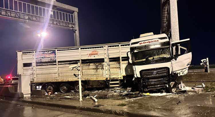 M.Y. yönetimindeki 06 DSM 693 plakalı tır, Hatay-Adana Otoyolu’nun Dörtyol gişelerinde HGS direğine çarptı. Çarpmanın etkisiyle tırda yangın çıktı.