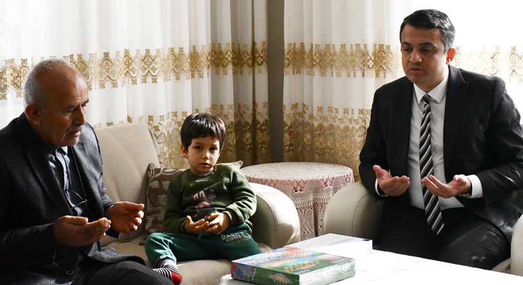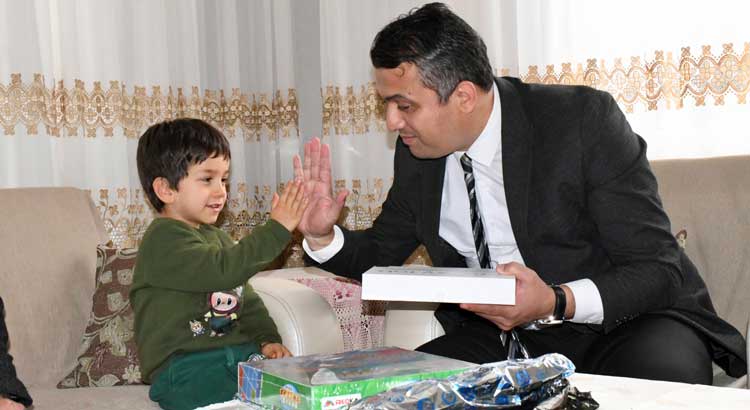 Özerli Mahallesi’nde yaşayan Gazi ailesini evlerinde ziyaret eden Kaymakam Keklik, ailenin en küçük ferdi Ömer Yusuf’u yaş pasta ile sevindirirken, hem doğum gününü kutladı, hem de çeşitli hediyeler takdim etti.