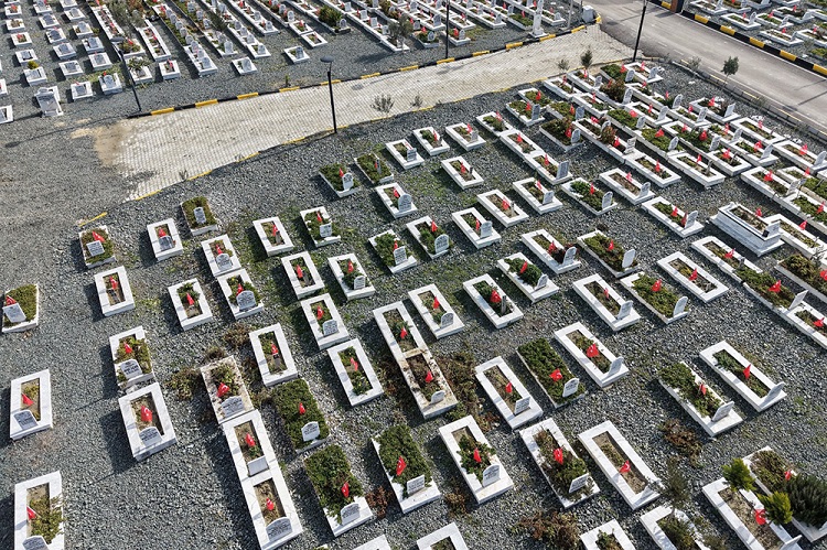 HBB, ilaçlama çalışmalarıyla da şehitliği dezenfekte edip 4 bin adet Türk Bayrağını şehit mezarlarına dikerek 6 Şubat için hazır hale getirdi.