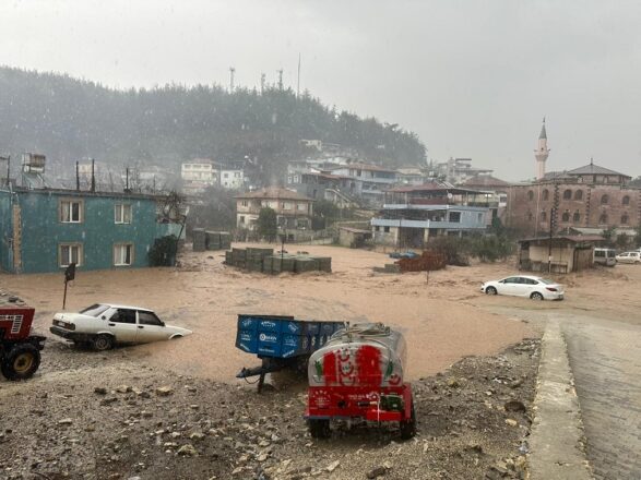 Yayladağı’nda etkili olan sağanak nedeniyle ev ve iş yerlerini su bastı, caddelerde su birikintileri oluştu, bazı araçlar yolda mahsur kaldı.