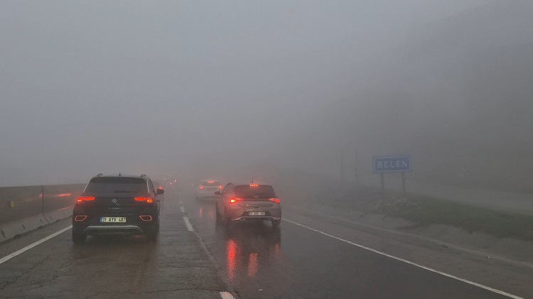 Sis nedeniyle Belen-İskenderun kara yolunda görüş mesafesi 10 metreye kadar düştü, sürücüler yolda dikkatli ilerledi.