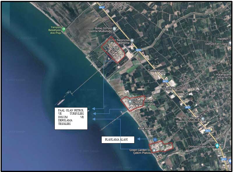 Çaylı Mahallesi 107 ada 1 parsel, 108 ada 1 parsel, 110 ada 1 parsel, 109 ada 1 parsel ve 2366 parselleri kapsayan ve mülkiyeti Habaş Petrol Ürünleri Sanayi ve Ticaret A.Ş. ye ait plan değişikliğine konu alan, Hatay Büyükşehir Belediye Meclisi’nin 10.05.2018 tarihli ve 162 sayılı Kararı ile onaylanan Hatay 1/100.000 ölçekli Çevre Düzeni Planı’nda “Kentsel Meskûn (Yerleşik) Alan” ve “Tarım Alanı” kullanımlarında kalmaktadır.