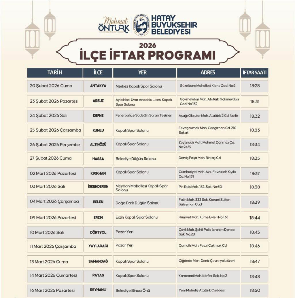 Hatay Büyükşehir Belediyesi (HBB) Başkanı Mehmet Öntürk, Ramazan ayı dolayısıyla yayınladığı kutlama mesajda, “Başı rahmet, ortası mağfiret, sonu ise cehennem ateşinden kurtuluş olan on bir ayın sultanı Ramazan’ı siz kıymetli hemşehrilerimle birlikte bir kez daha karşılıyoruz. Üzerimize güneş gibi doğan bu mukaddes ayın bizlere hediye ettiği bereketle sahurlarımızı yapıp, devletimizden aldığımız güç ve milletimizin dayanışma ruhuyla hep beraber ayağa kaldırdığımız Hatay’ımızın 15 ilçesinde kuracağımız iftar sofralarında, muhabbetle oruçlarımızı açacağız. Manevi iklimiyle huzur bulduğumuz bu mübarek ayda, Ramazan’ın güzelliklerini ve coşkusunu birlik ve beraberlik içerisinde yüreklerimizde hissedeceğiz. Cenabı Allah’tan bin aydan daha hayırlı olan Ramazanı Şerif’in ülkemiz, milletimiz ve tüm dünyaya hayırlar getirmesini diliyor ve hemşehrilerimle beraber Ramazan Bayramı’na sağlıklı ve huzurlu bir şekilde ulaştırmasını temenni ediyorum” dedi.