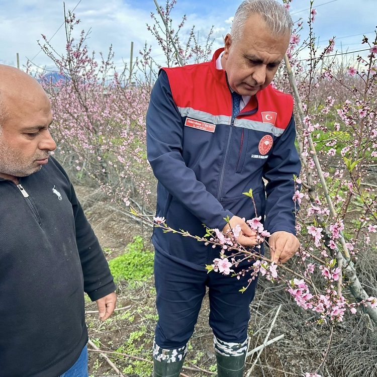 Bahçelerdeki çiçeklenme durumu yerinde gözlemleyerek, meyvelerin gelişim sürecini yerinde inceleyen Türkmen ve Samyeli, üretim sezonunun en kritik evrelerinden biri olan çiçeklenme döneminde; iklim koşullarının etkileri, bitki sağlığı durumu ve verim beklentileri üzerine teknik değerlendirmeler yaptı.