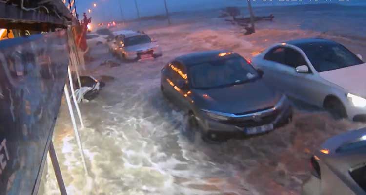 Kıyıdaki bir iş yerinin güvenlik kamerasının bu anları kaydettiği görüntülerde, seyir halindeki bir otomobilin sürücüsünün denizin taşması nedeniyle zor anlar yaşaması ve park halindeki bir motosikletin devrilmesi de yer aldı.