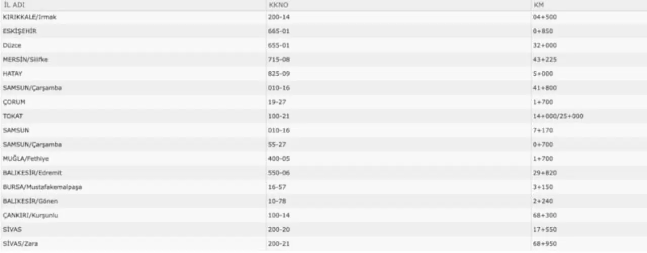 Kırıkkale’nin Irmak bölgesinde 200-14 numaralı kara nokta 4,5. kilometrede dikkat çekiyor. Eskişehir’de 665-01 kodlu nokta 0,85. kilometrede, Düzce’de ise 655-01 numaralı kara nokta 32. kilometrede sürücülerin uyarısına ihtiyaç duyuyor. Mersin’in Silifke ilçesinde 715-08 kodlu 43,225. kilometrede, Hatay’da 825-09 kodlu 5. kilometrede riskli noktalar bulunuyor. Samsun’un Çarşamba ilçesinde 010-16 kodlu nokta 1,7. kilometrede yer alırken, Çorum ve Tokat’ta da sürücülerin dikkatli olması gereken noktalar mevcut. Muğla’nın Fethiye ilçesinde 400-05 kodlu 1,7. kilometre, Balıkesir’in Edremit ve Gönen ilçelerinde 550-06 ve 10-78 kodlu 29,82 ve 2,24. kilometre, Bursa’nın Mustafakemalpaşa ilçesinde 16-57 kodlu 3,15. kilometre kara noktalar olarak öne çıkıyor. Çankırı Kurşunlu’da 100-14 kodlu 68,3. kilometre ve Sivas ile Zara ilçelerinde 200-20 ve 200-21 kodlu 17,55 ve 68,95. kilometreler de riskli noktalar arasında yer alıyor.