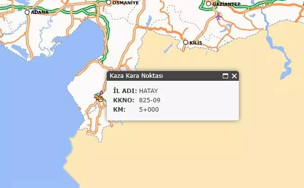 KGM, trafik kazalarının belli bir türde yoğunlaşarak sıkça tekrarlandığı yol kesimlerini adlandırdığı “kaza kara noktası” olarak açıkladığı 25 yol kesimi arasında Hatay – 825-09 Karayoluna yer verdi. Sistematik olarak sık kaza görülen kritik noktalar arasında yer alan yolun Hatay’dan başlayarak Adana ve Osmaniye yönüne uzanan önemli bir arter olduğu vurgulandı.