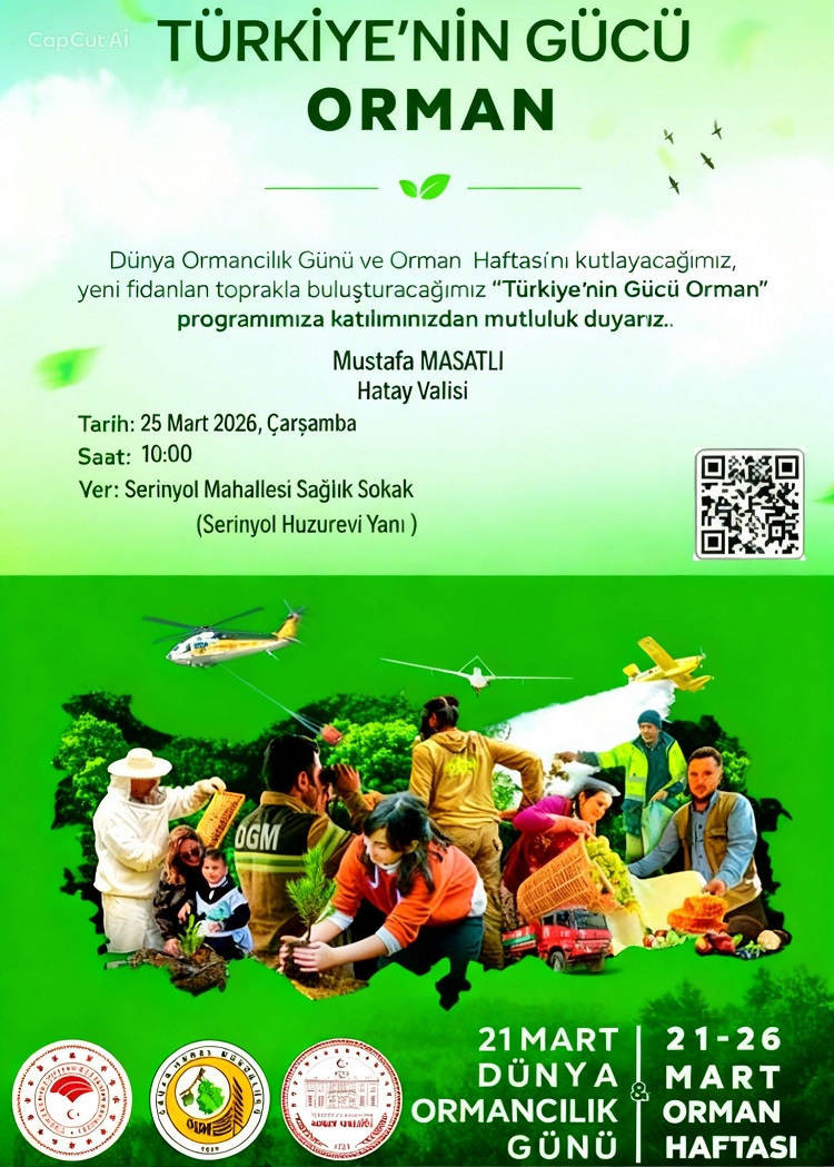 Günay, ayrıca Hatay Valisi Mustafa Masatlı’nın katılımıyla 25 Mart Çarşamba günü Serinyol Mahallesi Sağlık Sokak(Serinyol Huzurevi yanı)’ta Dünya Ormancılık Günü ve Orman Haftası’nı ‘Türkiye’nin gücü Orman’ temasıyla fidan dikerek kutlayacaklarını da ifade etti.