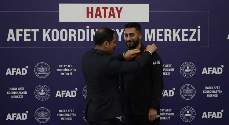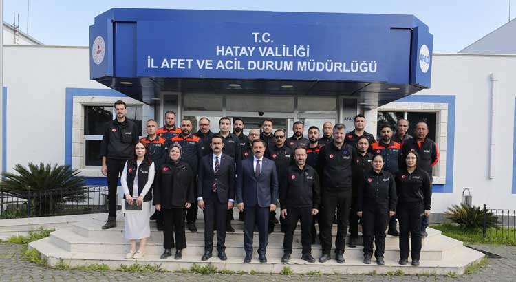 Hatay Valisi Musata Masatlı, AFAD İl Müdürlüğü’nde görevli görev yapan yönetici ile arama – kurtarma personeline rütbe işaretlerini takarak, başarı belgelerini takdim etti.