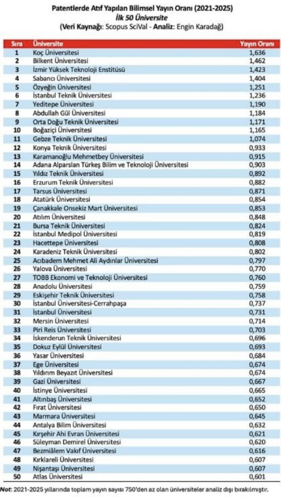 İskenderun Teknik Üniversitesi, 2021–2025 dönemine ilişkin patentlerde atıf yapılan bilimsel yayın oranı analizinde ilk 50 üniversite arasında yeraldı. Scopus SciVal verileri baz alınarak hazırlanan analize göre İSTE, Türkiye genelinde 34. sırada yer alarak önemli bir başarı elde etti.
