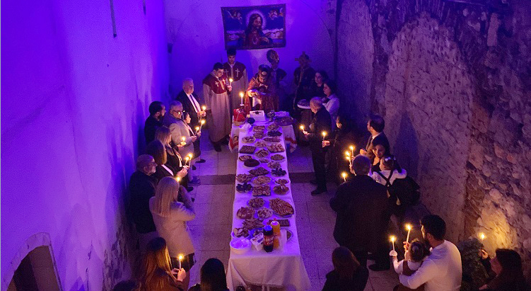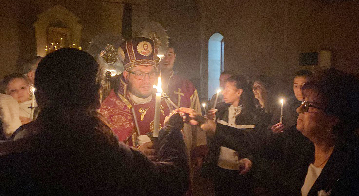 Ayin sırasında kilisenin ışıklarının söndürülmesiyle Peder Tabaşyan’ın elindeki mumdan, mumlarını yakan cemaat karanlığı aydınlatırken, ilahiler eşliğinde kilise bahçesine geçti. Peder Tabaşyan, kilise bahçesinde ilahiler eşliğinde ekmek, yumurta, su ve tuzu kutsadı.