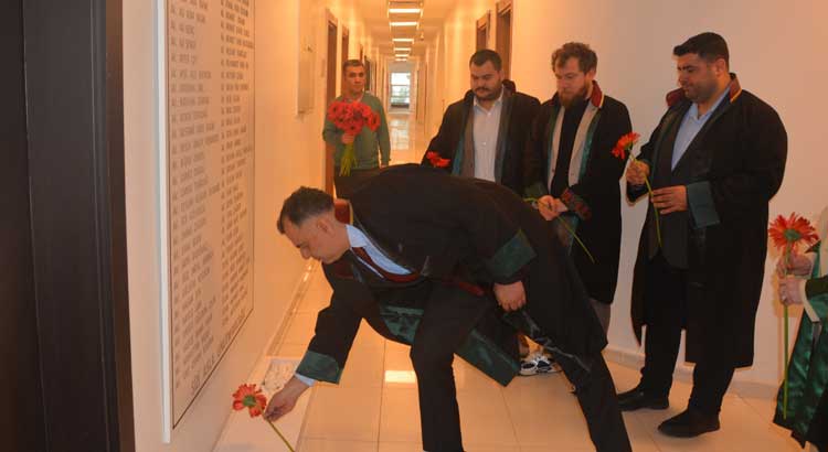 Saygı duruşu, İstiklal Marşı’nın okunması ve çelenk sunumunun ardından, avukatlar Hatay Adliyesi’nde bulunan anıta 6 Şubat’ta vefat eden meslektaşları anısına çiçek bırakarak, deprem şehitlerini saygı, rahmet ve minnetle andı.