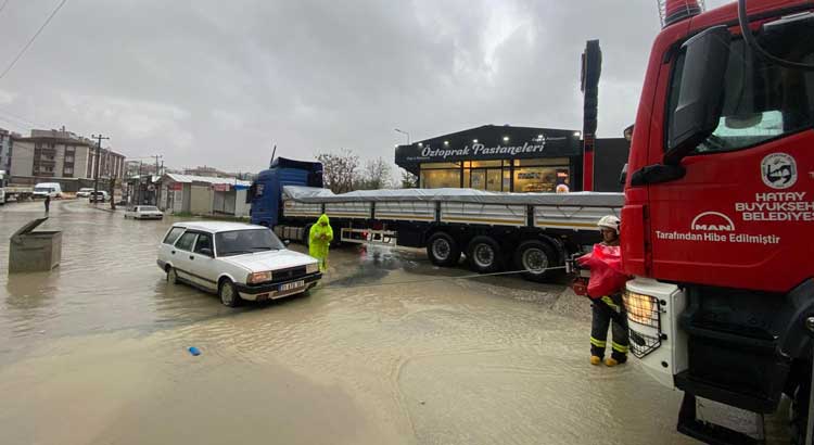 Su taşkını dolayısıyla Güzelburç Mahallesi’nde serviste mahsur kalan öğrenciler ile sular içinde kalan araçlar Hatay Büyükşehir Belediyesi itfaiye ekiplerince bulundukları yerden güvenle kurtarılırken, çekici ve kurtarma çalışmaları da eş zamanlı olarak yürütüldü.