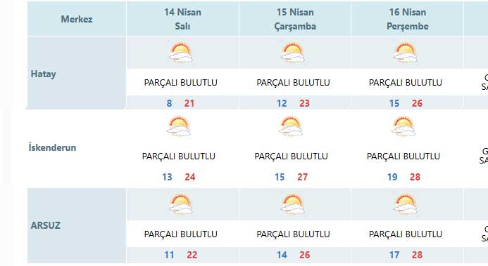 Meteorolojik tahminlere göre Hatay il merkezi Antakya’da Perşembe günü hava sıcaklığının 26 dereceye kadar yükselmesi beklenirken, sıcaklıkların Erzin’de 29, Arsuz, İskenderun, Kırıkhan ve Samandağ’da ise aynı gün 28 dereceye yükselmesi tahmin ediliyor.