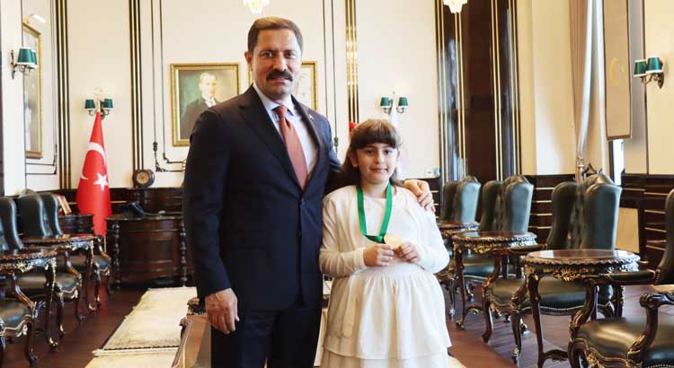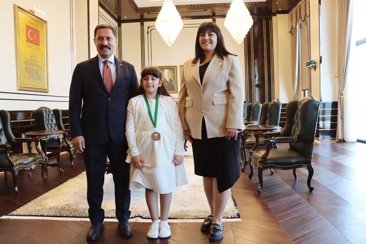 Hatay Valisi Mustafa Masatlı, şehit polis memuru Emirhan Şimşek’in NextGen Uluslararası İngilizce Olimpiyatı’nda dünya 3’üncüsü olan 9 yaşındaki kızı Ömür Şimşek’i makamında kabul etti.