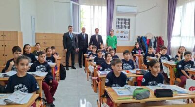 Hatay Valisi Mustafa Masatlı, İl Milli Eğitim Müdürü Harun Tüysüz ile birlikte Doğanköy İlkokulu ile...
